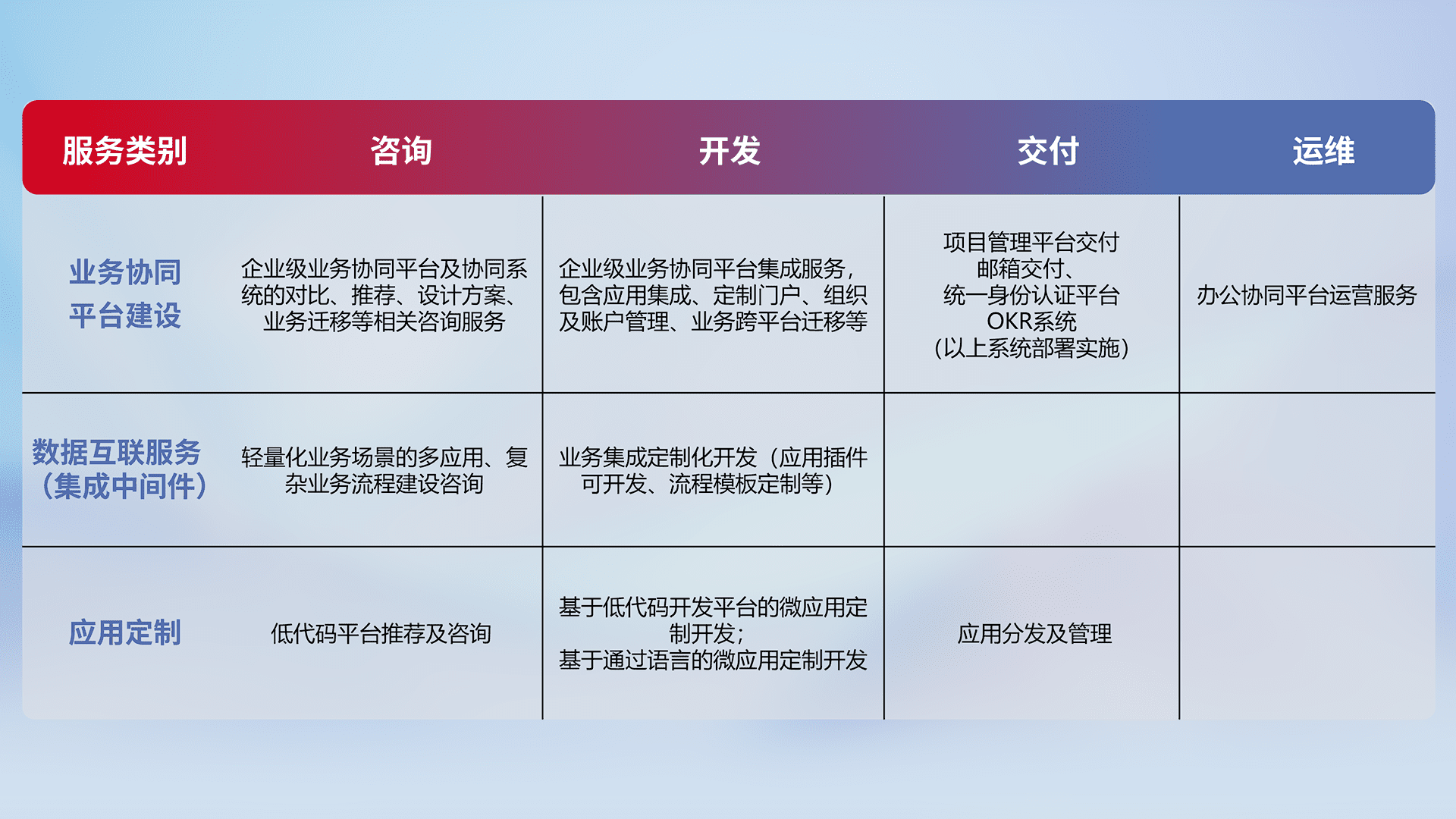 针对钉钉、、企微、、、IDaas等平台级产品提供产品的规划、、、、方案、、、、交付、、、定制化开发等服务,,,,实现如统一协同办公、、、、智能客户服务、、、、混合会议管理、、智能数据查询、、、、等业务场景,,,,实现数字化转型。。。。